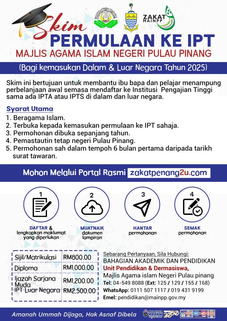 Permohonan hanya dipertimbangkan untuk pengajian KALI PERTAMA sahaja bagi setiap peringkat.