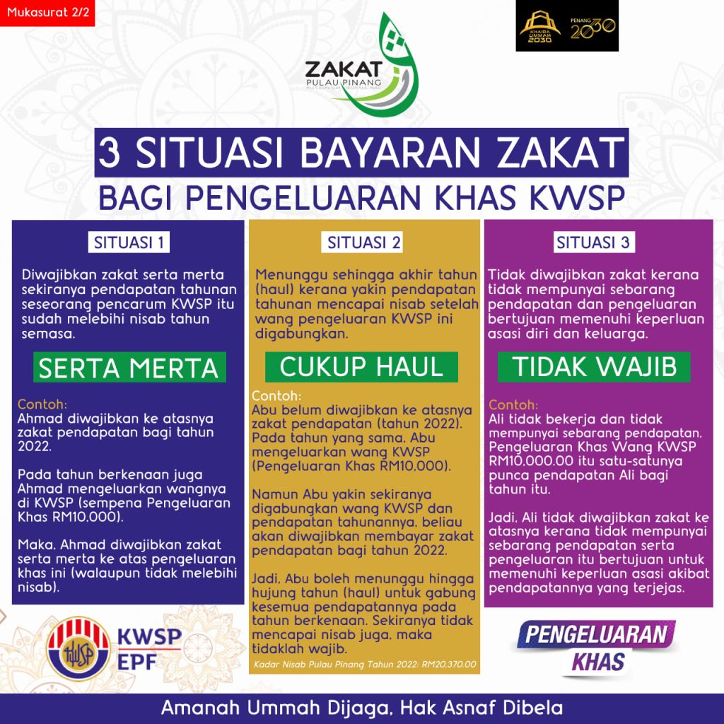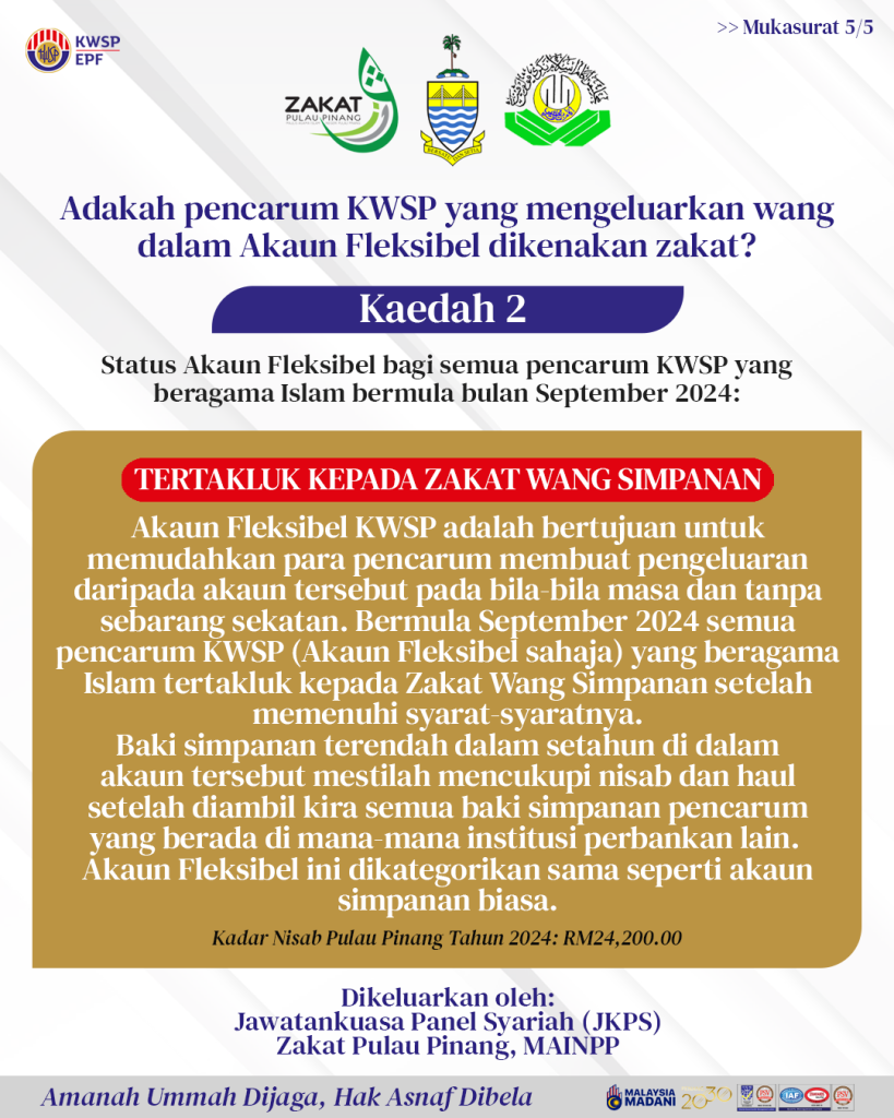 * Kadar zakat 2.5% ke atas wang caruman KWSP ketika dikeluarkan sama ada selepas bersara atau dikeluarkan untuk lain-lain tujuan sebelum bersara. Dibayar setiap kali pengeluaran dibuat dengan jumlahnya melebihi nisab.